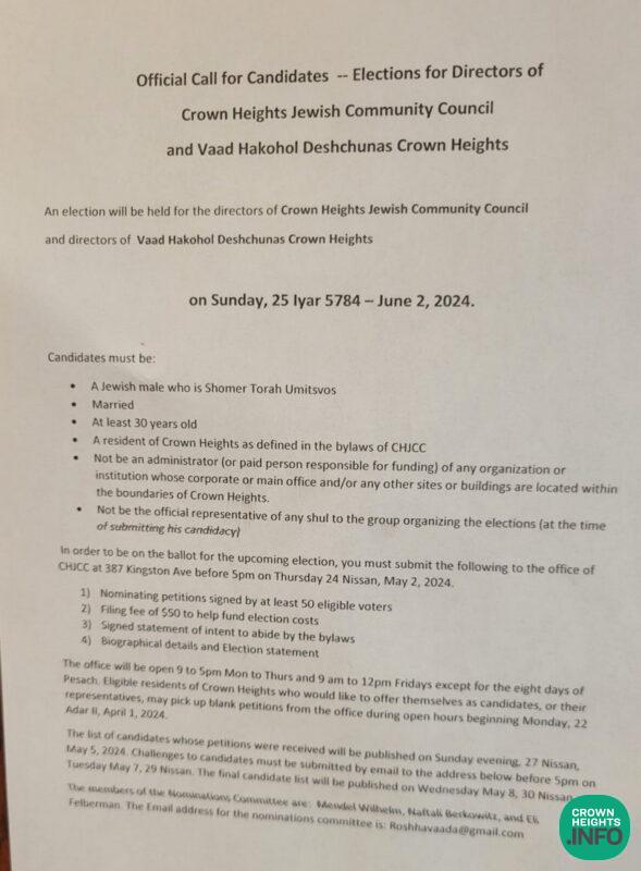 Signs are being placed in eligible Crown Heights Shuls calling for candidates to run for the Crown Heights Jewish Community Council and the Vaad Hakohol of Crown Heights.
