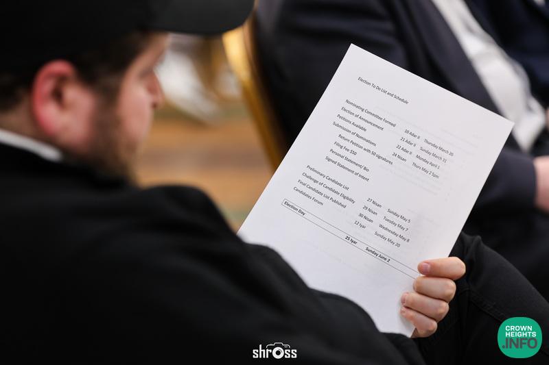 At the meeting, that was held at Getzel’s Shul, Rabbi Moshe Feiglin of Aliya, opened with a Dvar Torah about the importance of a Korban Oni. Eli Felberman reviewed the response from the Beis Din of Crown Heights authorizing the election. This was followed by a vigorous debate and the appointment of the committees.