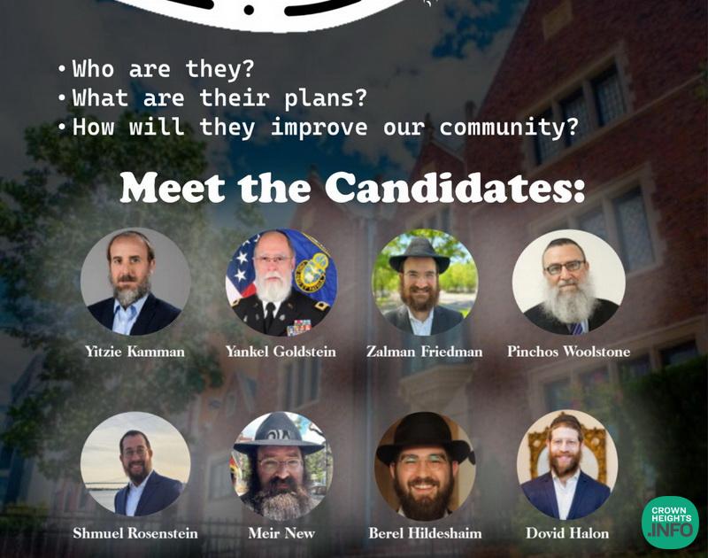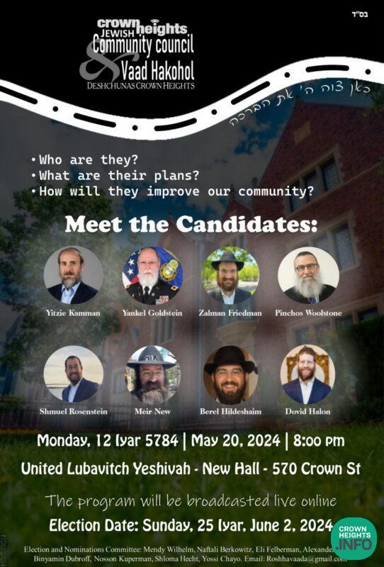 Leading up to the “Meet the Candidates” event for the Vaad Hakohol Deshchunas Crown Heights election taking place on Monday, the 12th of Iyar, May 20th, 8:00pm at the Lubavitcher Yeshiva Side Hall, the field of candidates has narrowed slightly.