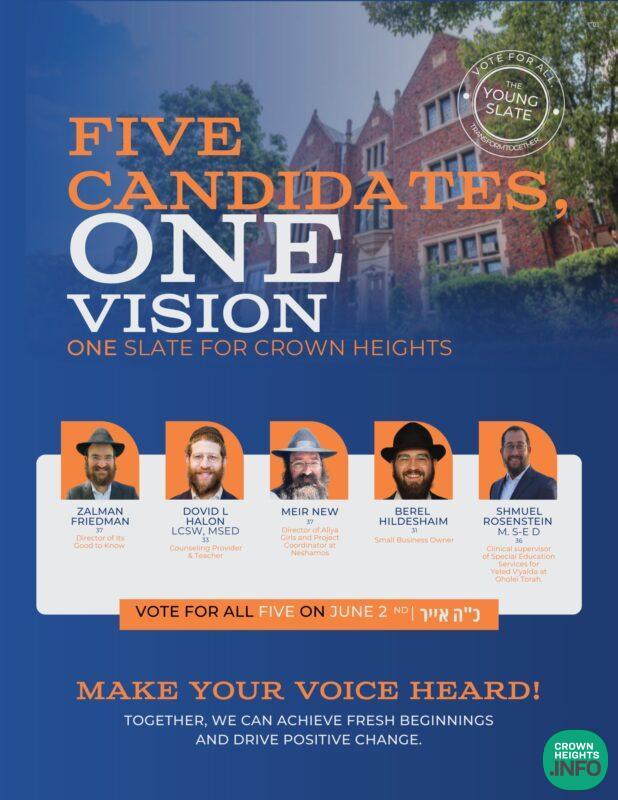 The slate is composed of five candidates: Zalman Friedman, Dovid Leib Halon, Berel Hildeshaim, Meir New, and Shmuel Rosenstein.