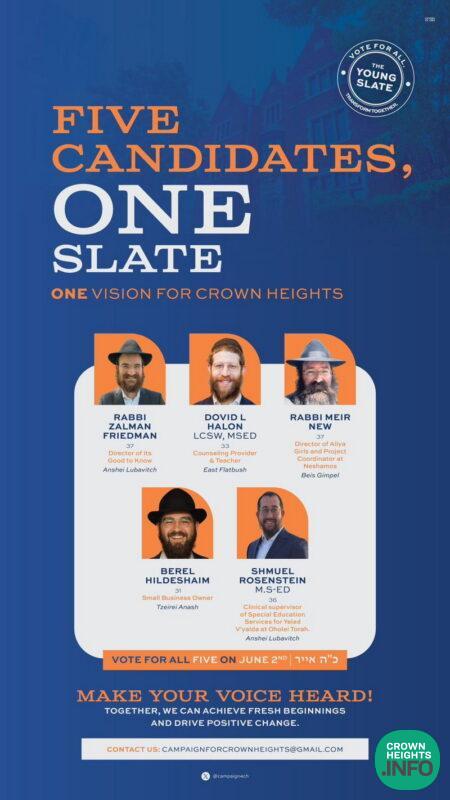 The slate of candidates running for the Vaad Hakahal, include Meir New, Berel Hildesheim, Dovid Leib Halon, Zalman Friedman, and Shmuel Rosenstein, is committed to actively representing the interests of the Crown Heights Jewish community.