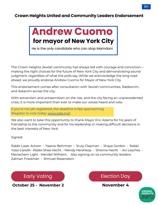 The Crown Heights Jewish community has always led with courage and conviction—making the right choices for the future of New York City and demonstrating sound judgment, regardless of what the polls say. While we acknowledge the long road ahead, we proudly endorse Andrew Cuomo for Mayor of New York City.