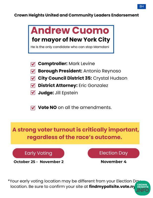 We encourage everyone to vote for Andrew Cuomo — he is the only candidate who can defeat Mamdani. A strong voter turnout is critically important, regardless of the race’s outcome. Elected officials pay close attention to which districts turn out to vote, and this can shape future policy. This may be the most important local election of our lifetime.