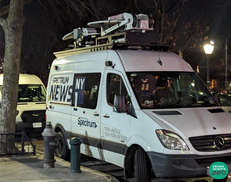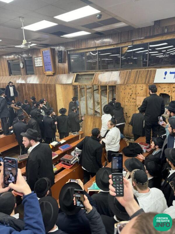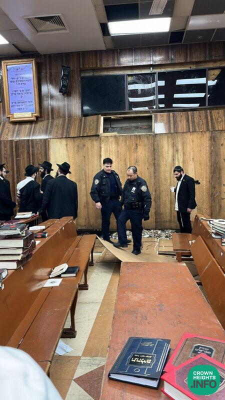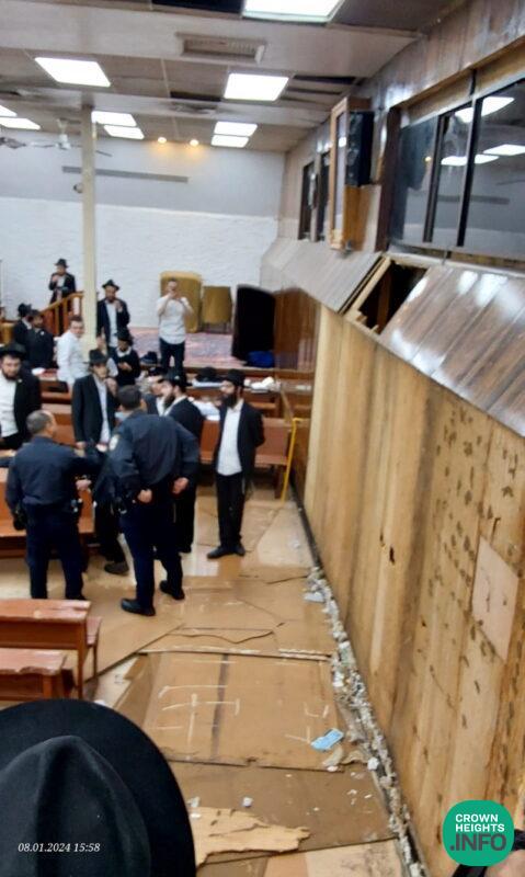 Update 10:20pm: At present, the scene outside 770 remains active and chaotic with news vans arriving to cover the story. Inside the Shul of 770 has been cleared of all non-emergency personnel and efforts are underway to repair some of the damage done.