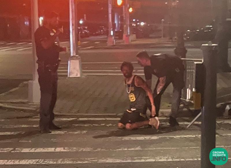 On their social media, Crown Heights Shomrim wrote “At approx 1 AM, Shomrim received multiple calls for a subject walking around with a weapon, possibly an axe, chasing people and smashing multiple car and bus windows. Great collaboration with officers from @NYPD71PCT results in one UNDER arrest with a metal pipe. #CHSafe.”