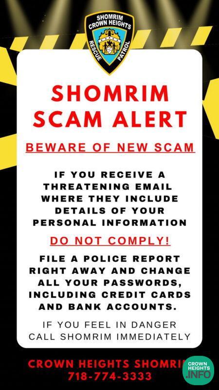 Crown Heights Shomrim has published an alert to the Jewish community after an old scam, with a new spin, has been reported in the community.