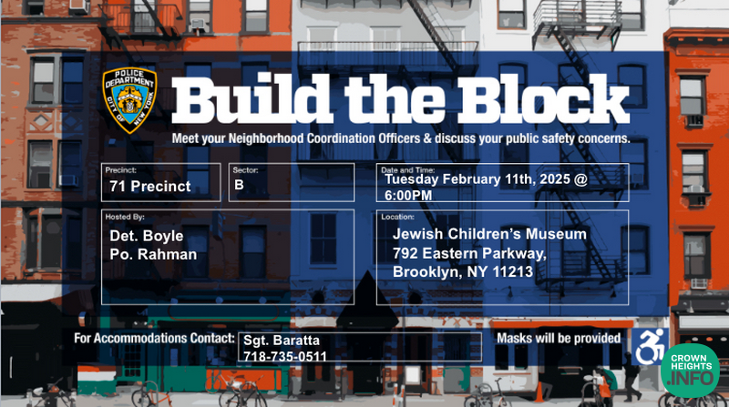 The 71st NYPD Precinct will be holding its scheduled Build the block meeting for Sector B, the area from New York Ave to Rochester Ave and Eastern Parkway to Empire Blvd, today, Tuesday February 11th.