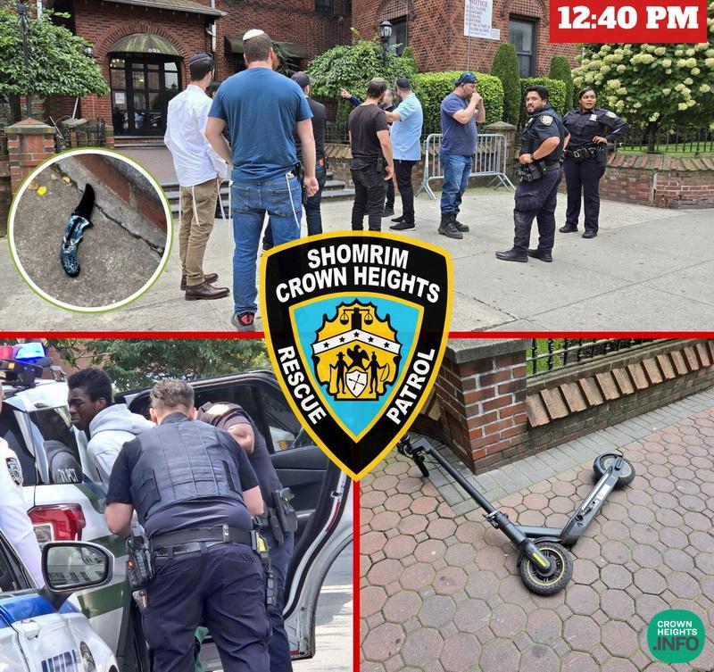 “Thanks to the swift response of Shomrim volunteers and the outstanding work by @NYPD71Pct, the suspect who brandished the knife was quickly apprehended, and the weapon recovered,” Shomrim wrote on social media. The second perpetrator, who is in possession of a stolen scooter, is still at large.