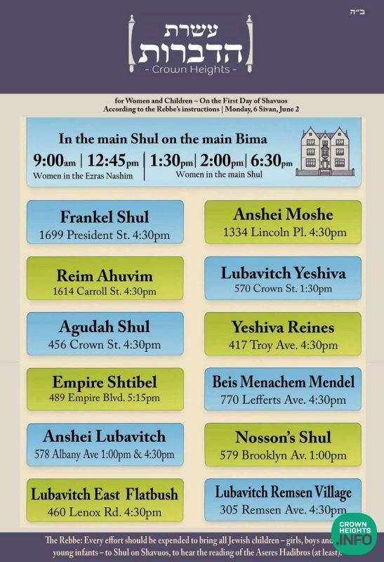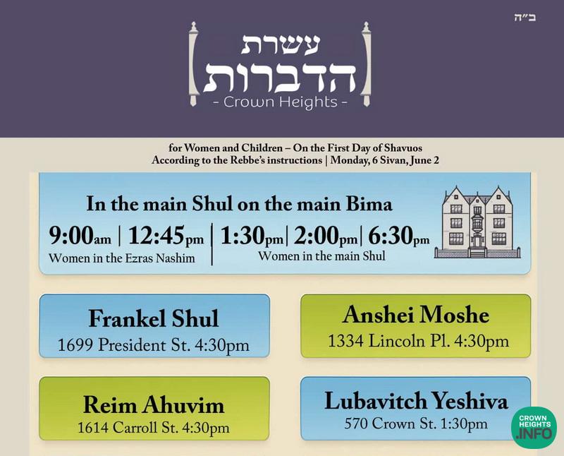 The Rebbe encouraged everyone, including women and children, to hear the Aseres Hadibros on Shavuos. To help those who would not be able to attend during normal davening times, here are some alternative reading times.