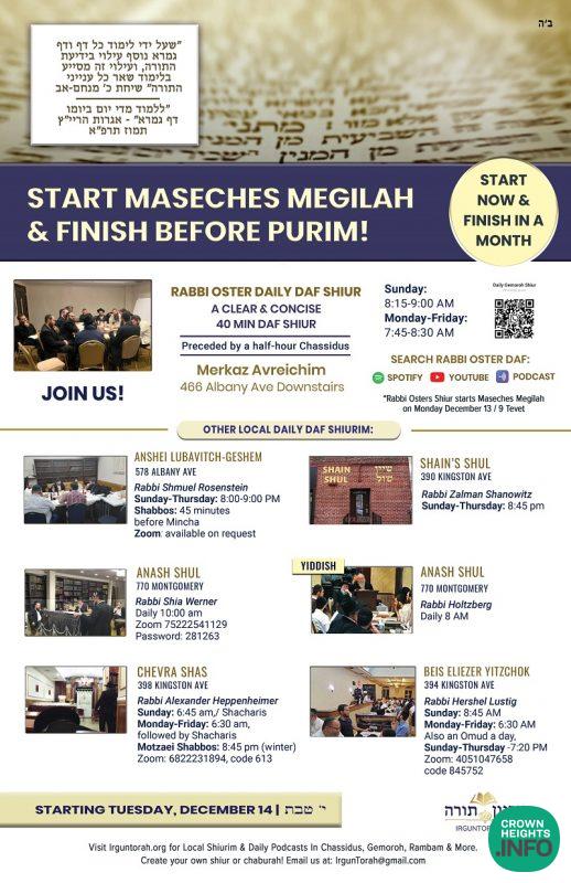 Join one of seven daily Gemora shiurim in Crown Heights and online that art starting to learn Meseches Megilah, giving an opportunity to learn three mesechtos in three months.