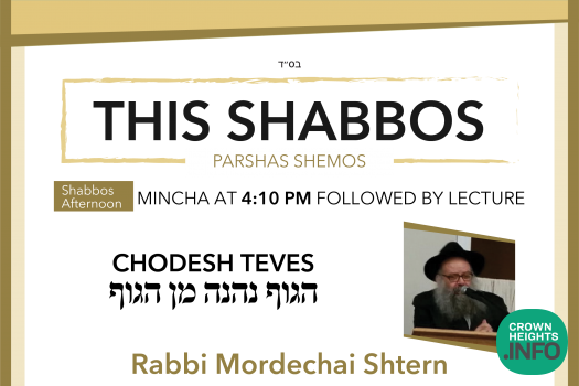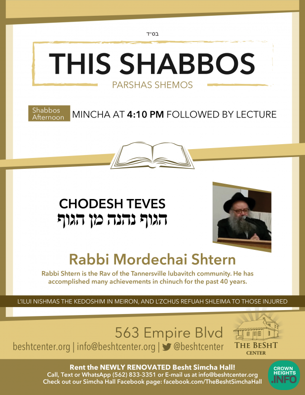 This Shabbos at the BESHT: Rabbi Mordechai Shternis the Rav of the Tannersville lubavitch community. He has accomplished many achievements in chinuch for the past 40 years. He will be giving this weeks shiur on the topic of Chodesh Teves: Haguf Nehne Min Haguf.