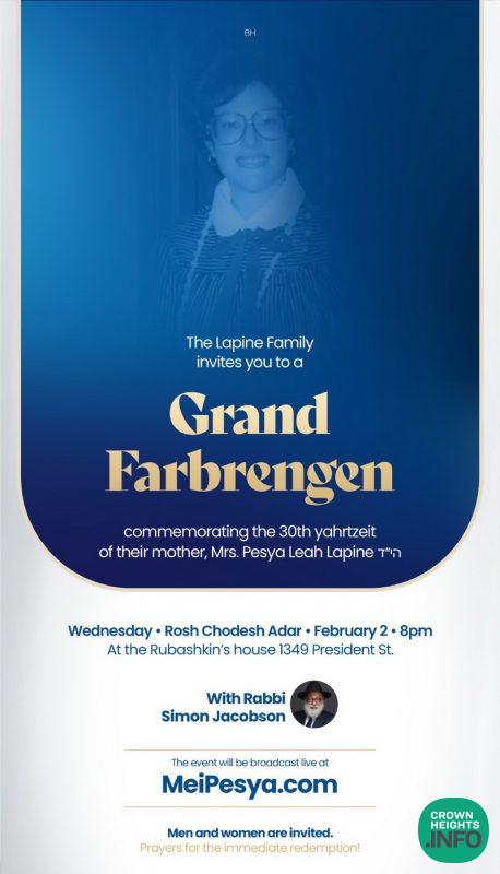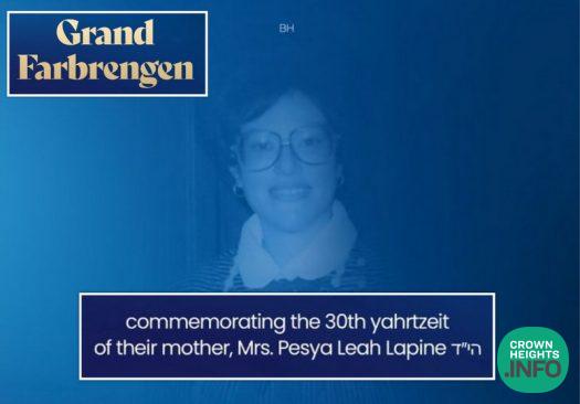 The community is invited to join for a Farbrengen and Event taking place for the Yartzeit of Mrs. Pesya Lapine HY”D.