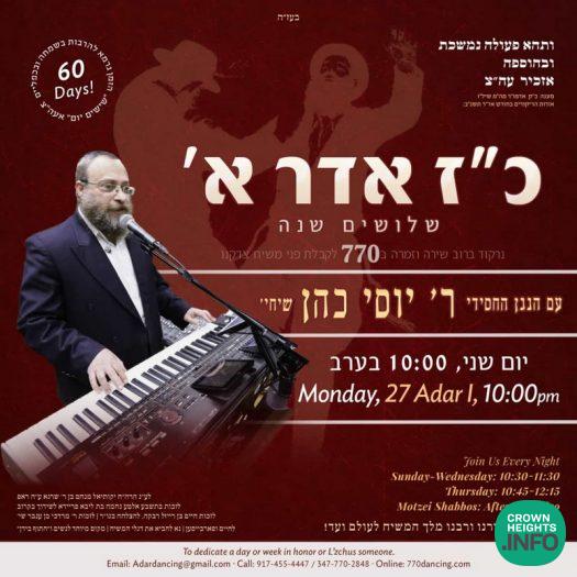 In this spirit, and in marking 30 years since 27 Adar I 5752, Anash and Tmimim are invited to 770 – Beis Chayeinu at 10 PM tonight (Monday) for joyous dancing “with a great Shturem,” featuring live music from R’ Yossi Cohen (who also headlined the dancing in 5752). Through our Simcha, we will nullify all the remaining undesirable things, and dance together to the Beis Hamikdash in Yerushalayim, with the Rebbe leading us.