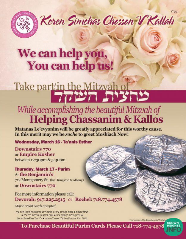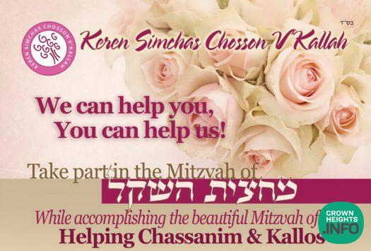 One of the customs observed during the Fast of Esther is the Mitzvah of Machtzis Hashekel which is given around Mincha time. Support Keren Simchas Chosson V’kallah through this special mitzvah and help a Chosson and Kallah have a beautiful wedding.