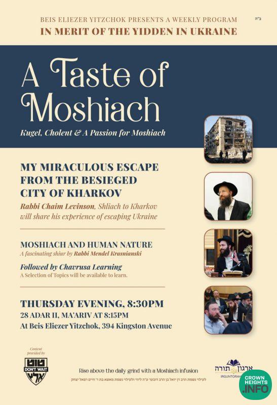 This Thursday, Rabbi Chaim Levinson of Kharkov, Ukraine, will share the story of his miraculous escape from the war torn region, to all the participants of the weekly Taste of Moshiach shiur at Beis Eliezer Yitzchok, 394 Kingston Ave.