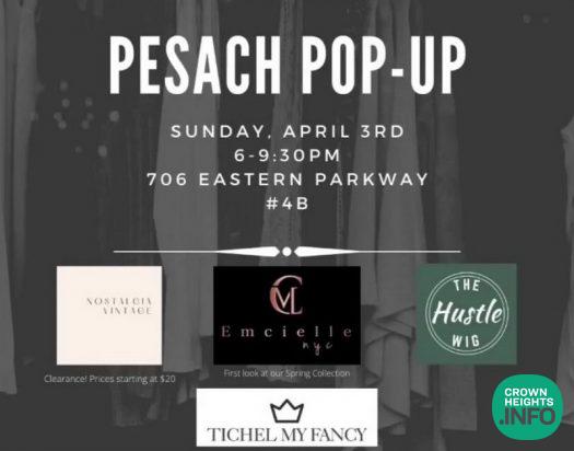 A Pesach Pop Up Shop for Women will be open tonight, Sunday April 3rd 6:00pm – 9:30pm, showcasing small businesses in Crown Heights.