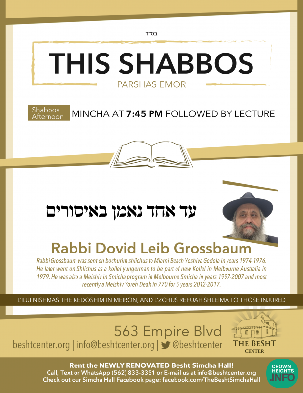 This Shabbos at the BESHT: Rabbi Dovid Leib Grossbaum was sent on bochurim shlichus to Miami Beach Yeshiva Gedola in years 1974-1976. He later went on Shlichus as a kollel yungerman to be part of new Kollel in Melbourne Australia in 1979. He was also a Meishiv in Smicha program in Melbourne Smicha in years 1997-2007 and most recently a Meishiv Yoreh Deah in 770 for 5 years 2012-2017.