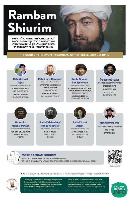 Participating Magidei Shiurim: Rabbi Mendel Yusewitz • Rabbi Zalman Hertzel – Tiferes Zekeinim • Reb Mendel Weintraub – 770 • Rabbi Michoel Zajac – Empire Shtiebel • Reb Mendel Potash – 8th grade • Rabbi Levi Rapaport – Reyim Ahuvim • Rabbi Shalom Ber Shpielman – Lefferts Shul.