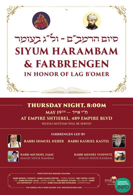Irgun Torah invites the community for a Farbrengen in Honor of Lag B’omer, and in honor of the annual Siyum HaRambam.