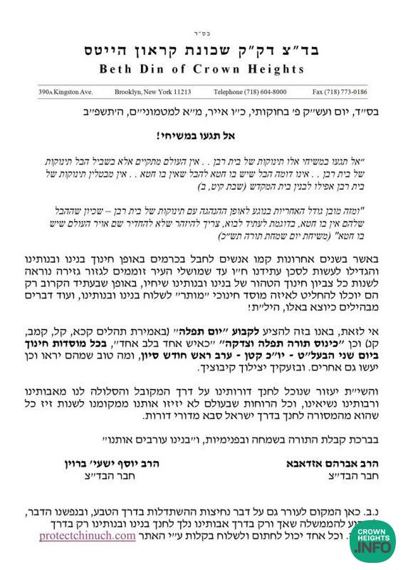 Rabbi Avraham Osdoba and Rabbi Yosef Braun, Members of the Badatz of Crown heights conclude the letter with a post Scriptum. “Here is the place to arouse also about the necessity of striving in the way of nature “Hishtadlus”, to inform the government that only in the way of our fathers will we go, to educate our sons and daughters in the way of the Torah. anyone can sign and easily submit their comments through the site protectchinuch.com