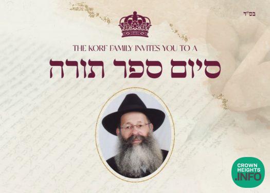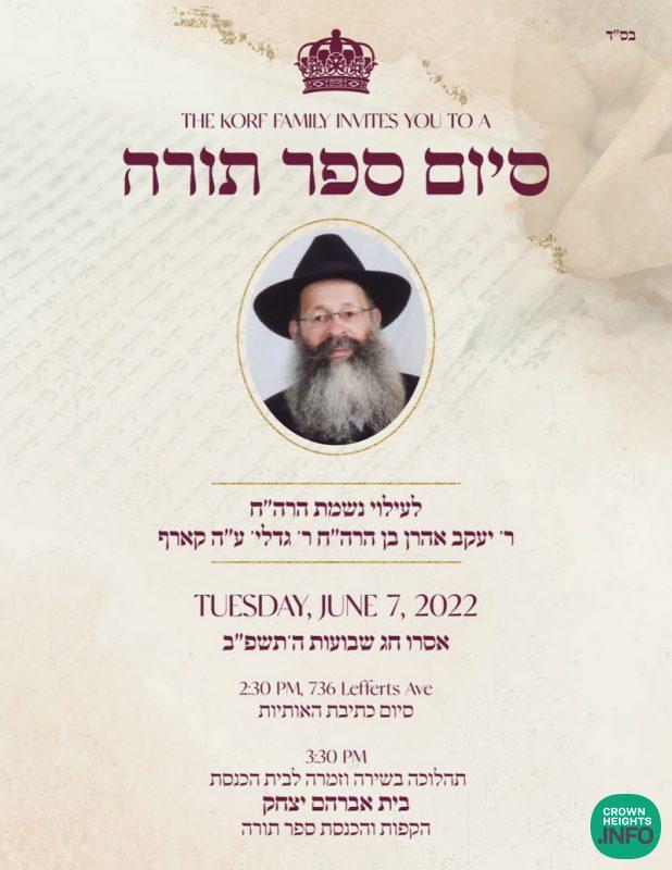 The Korf family invites the community to join them on Tuesday, June 7th, for the completion of a Sefer Torah in memory of Rabbi Yaakov Aharon Korf OBM.