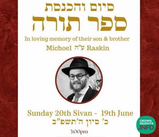 The Crown Heights community is invited to join the Raskin family for the completion of a Sefer Torah written in memory of R’ Michoel Raskin OBM, today, Sunday, 3:00pm at 1558 President Street.