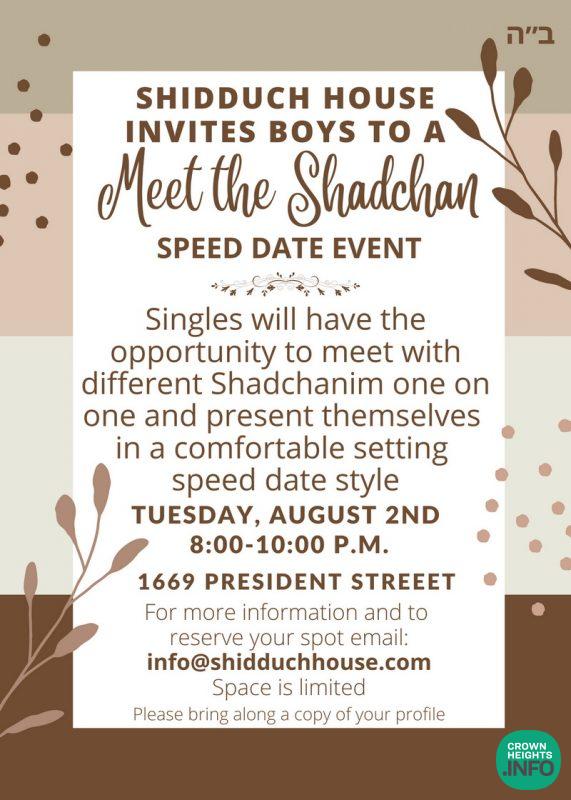 On Tuesday, August 2nd, our shadchanim will be meeting with boys and strongly encourage them to come. They will have the opportunity to meet with 6 different shadchanim one on one for 10 minutes each in a comfortable setting. These events have previously been fully booked with very positive feedback. To make a reservation to meet the shadchanim please email: info@shidduchhouse.com.