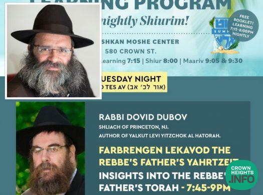 A special farbrengen as part of the Summer Learning Program, will be held at Mishkan Moshe, 580 Crown St. With Rabbi Dovid Dubav Shliach in Princeton, NJ and Author of Yalkut Levi Yitzchak Al HaTorah. At 7:45-9:00pm.
