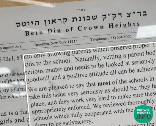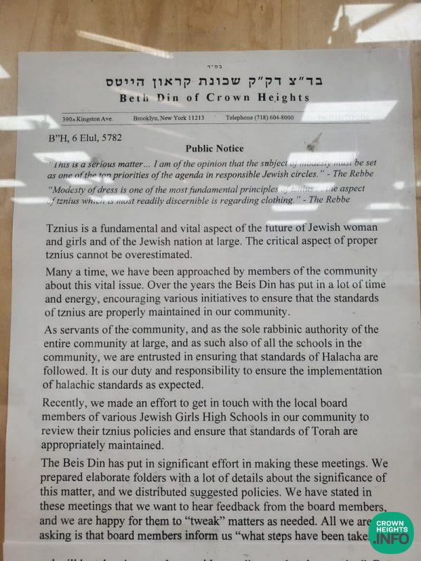 In a letter dated the 6th of Elul, the two members of the Crown Heights Beis Din outlined their work done over recent months to address the issue of Tznius in the Crown Heights community.