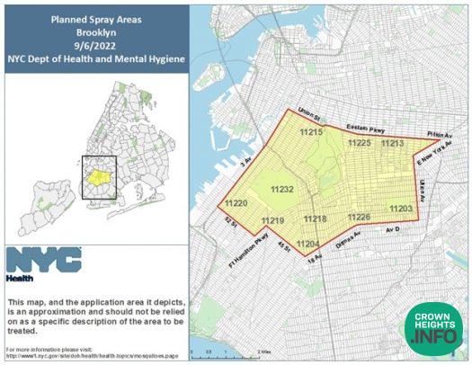 To reduce mosquito activity and the risk of West Nile virus, the New York City Health Department will spray for mosquitos in Crown Heights on Wednesday, September 7th, 2022.