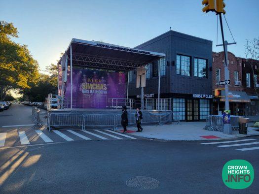 From its previous location in front of Shain’s Shul between Montgomery and Crown Street, the stage has been put up next door to the newly completed House of Glatt at the intersection of Crown Street and Kingston Ave, allowing for a larger dancing area in front of the stage as well as easier access.