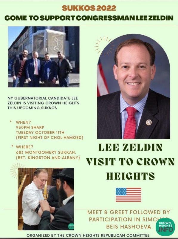 Zeldin will be coming to Crown Heights on Tuesday, October 11th, at 9:30pm. He will be sitting down with the community in the Sukkah at 683 Montgomery Street between Kingston and Albany Ave.