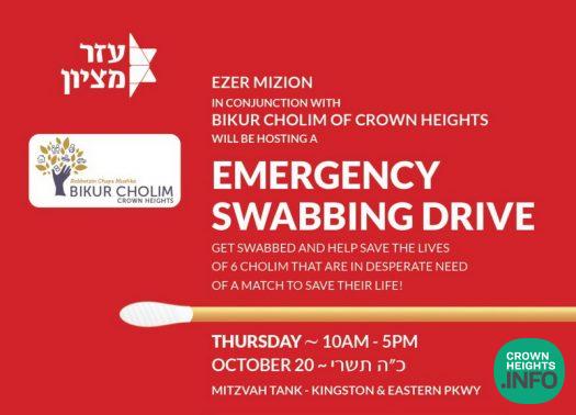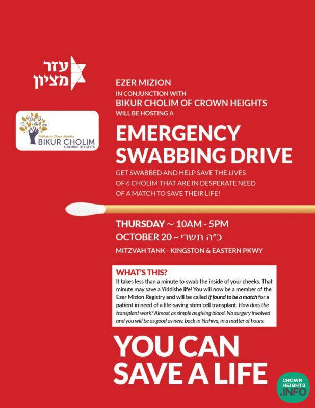Ezer Mizion, in conjuncture with Bikur Cholim of Crown Heights, will be hosting a Swab Drive this Thursday, October 20th, from 10:00am to 5:00pm at the Mitzvah Tank on Kingston Ave and Eastern Parkway.
