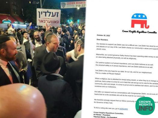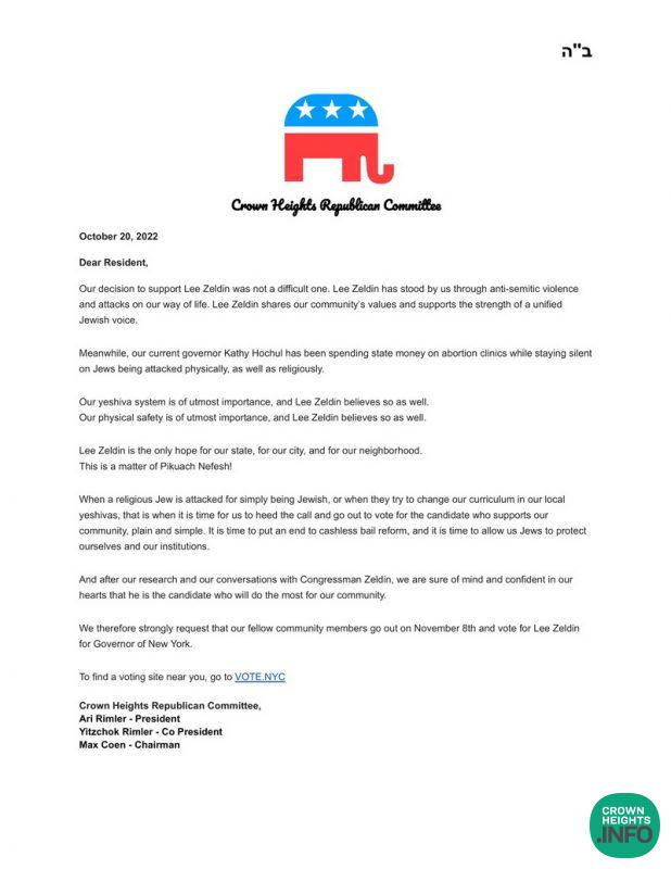The Crown Heights Republican Committee has endorsed Lee Zeldin for Governor, urging the citizens of Crown Heights to vote for him on November 8th.