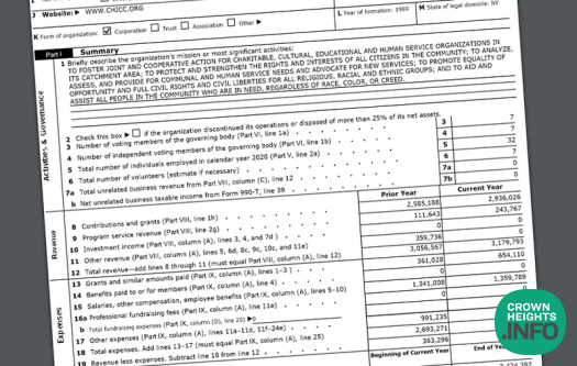 Since 2014, the Crown Heights Jewish Community Council has received over $18,500,000 in grants from US, State, and local governments. In the 2020 tax year alone, ending in June of 2021, the Community Council received $2,936,026 in contributions and grants for use in Crown Heights.