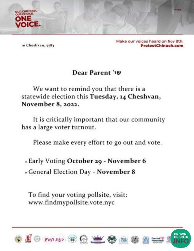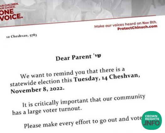 Not or tom but fourteen Crown Heights schools banding together under the Protect Our Chinuch organization to remind everyone in the community to vote.