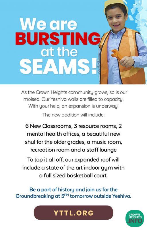 The Yeshiva walls are full to capacity. We will be expanding our building with a 5 story addition in front of the current landmark building, bringing it up to the Crown Street property line. The landscape of Crown Heights will change as our Yeshiva reaches New Heights.