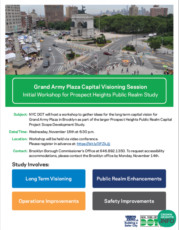 The New York City Department of Transportation is hosting a workshop TONIGHT Wednesday, November 16th, 2022 at 6:30PM via ZOOM to gather ideas for the long term capital vision for Grand Army Plaza as part of the larger Prospect Heights Public Realm Capital Project Scope Development Study.