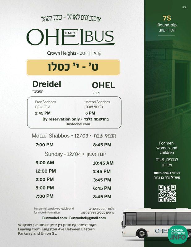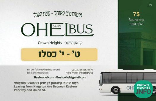 In honor of the the 9th and 10th of Kislev, the Ohel Bus Service will be providing extra subsidized transportation round trip from Crown Heights to the Ohel beginning on Motzei Shabbos, Dec. 3rd through Sunday, Dec. 4th.