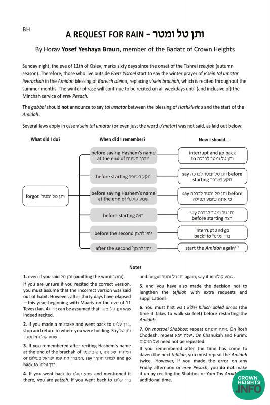 Sunday night, the eve of 11th of Kislev, marks sixty days since the onset of the Tishrei tekufah (autumn season). Therefore, those who live outside Eretz Yisroel start to say the winter prayer of v’sein tal umatar liverachah in the Amidah blessing of Bareich aleinu, replacing v’sein brachah, which is recited throughout the summer months. The winter phrase will continue to be recited on all weekdays until (and inclusive of) the Minchah service of erev Pesach.