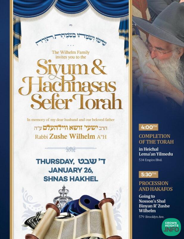 The Wilhelm Family is inviting the community to join them in Crown Heights this Thursday in welcoming a new Sefer Torah in memory of Reb Zushe Wilhelm OBM.