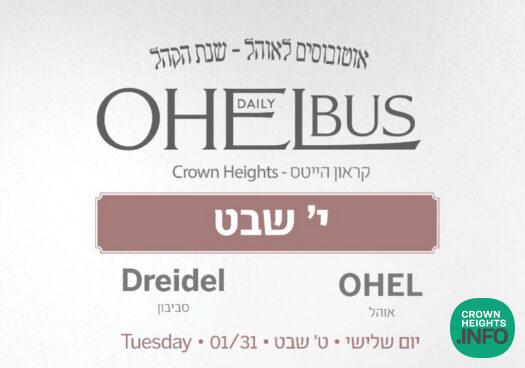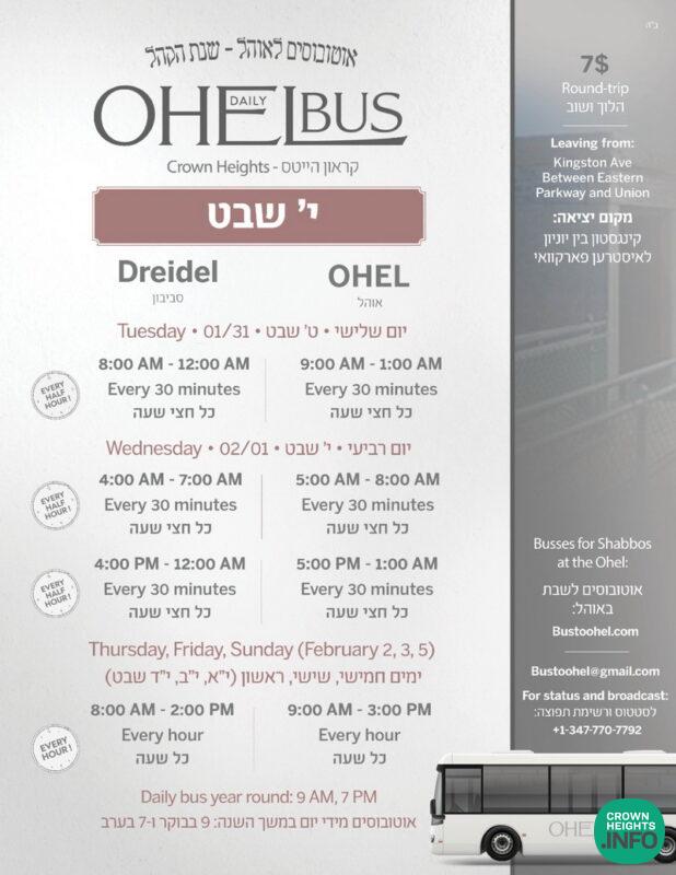 In honor of Yud Shvat, the Ohel Bus Service will be providing extra subsidized transportation round trip from Crown Heights to the Ohel on Tuesday, Jan. 31st through Thursday, Feb. 2nd.