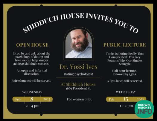 On Wednesday, February 8th from 2-4 p.m, Shidduch House will also be hosting an Open House with dating expert Rabbi Dr. Yossi Ives. It will be an opportunity to drop in and learn more about the psychology of dating and how we can help singles achieve relationship success. He will be available to answer questions and conduct informal discussions.