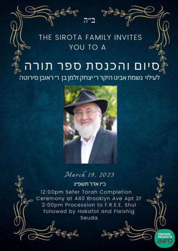 The event will take place this Sunday March 19th, 2023, 12:00pm Sefer Torah Completion at 440 Brooklyn Ave #2F, with a 2:00 Procession to FREE Shul on President Street.