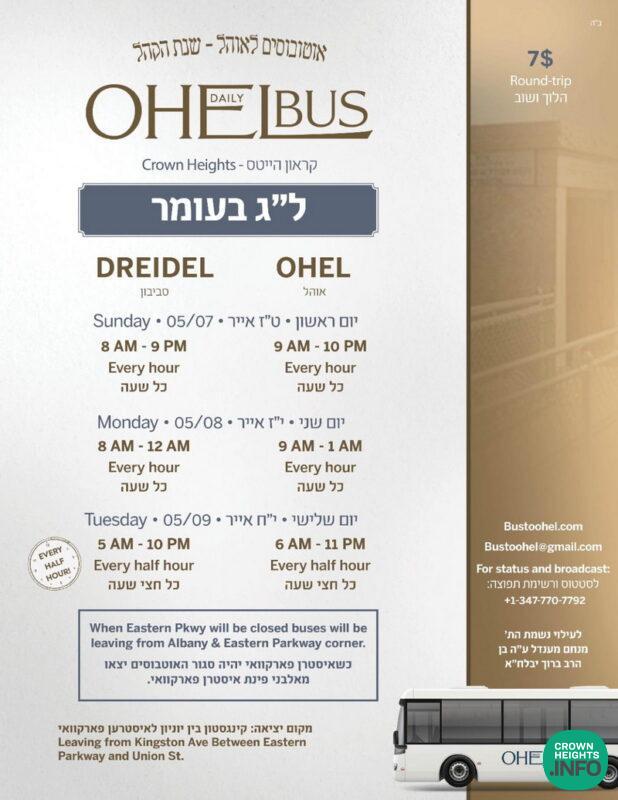 In honor of Lag B’Omer this year, the Ohel Bus Service will be providing extra subsidized transportation round trip from Crown Heights to the Ohel from Sunday, May 7th to Tuesday, May 9th.