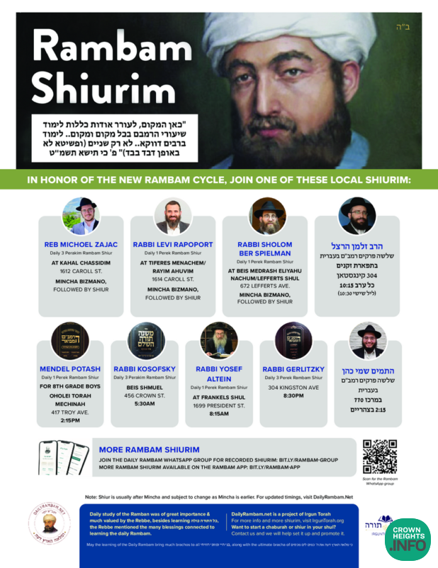 Local and Worldwide Online – Baruch Hashem, we are happy to announce that there will be available for the local community in crown heights and online a Rambam Shiurim from well-known magidei shiurim, which have experience in teaching and have the depth and knowledge to present a clear, insightful, and entertaining Daily Rambam Shiur.