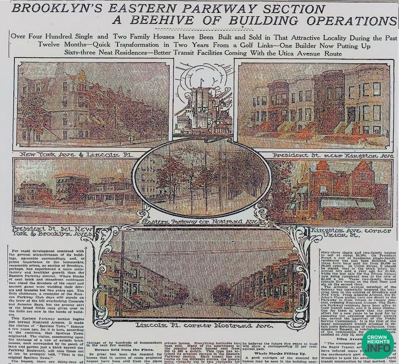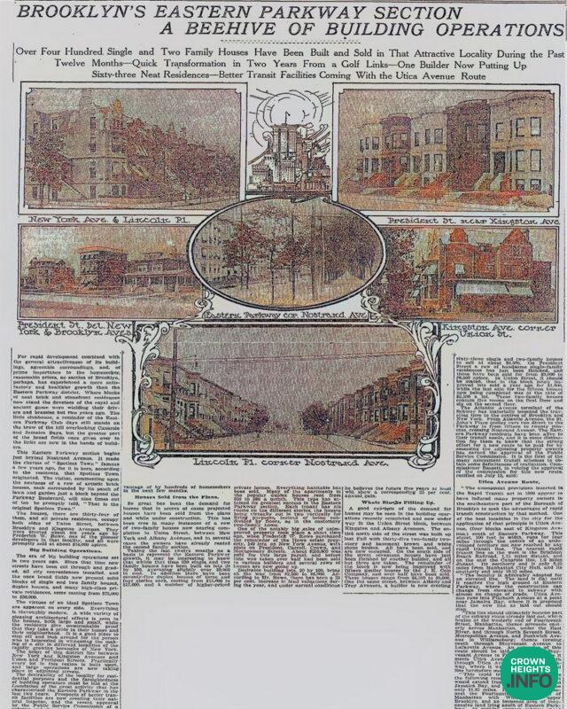 On July 31, 1910, an extensive feature article appeared in the Real Estate section of the New York Times, highlighting the rapid growth of Crown Heights, known then as the Eastern Parkway Section. The headline read “Brooklyn’s Eastern Parkway Section A Beehive of Building Operations.” The article noted the construction of 400 single and two-family houses were built in the preceding 12 months.