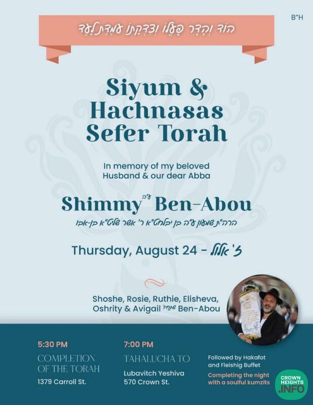 A Siyum Sefer Torah will take place today in Crown Heights in honor of Shimmy Ben-Abou OBM, with completion of the the Torah at 5:30pm and procession at 7:00pm.