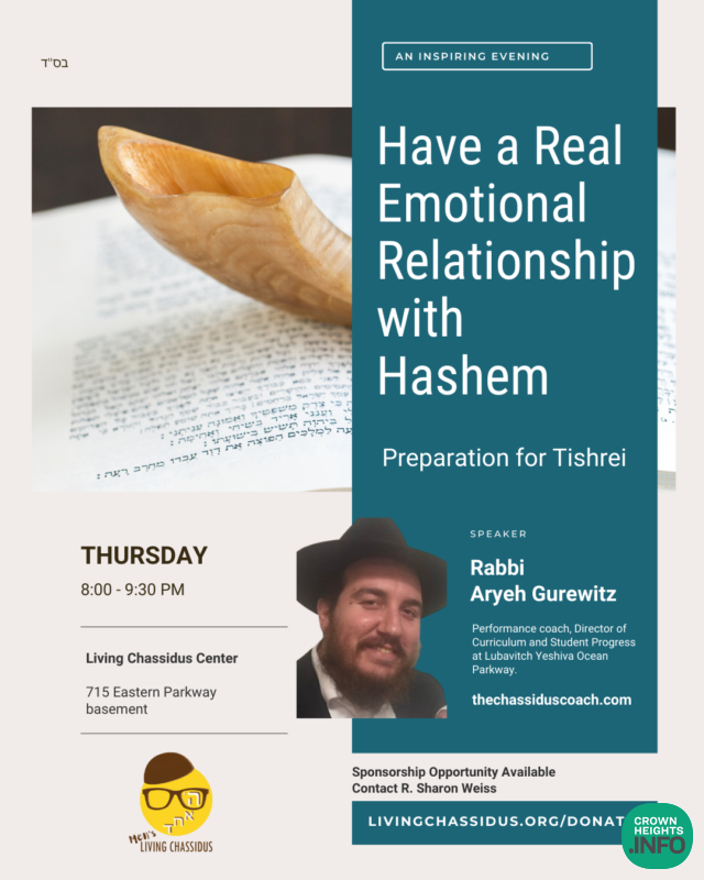 Living Chassidus Men’s Division is hosting an event tonight open to the community at the Living Chassidus Center located at 715 Eastern Parkway basement. It promises to be an evening filled with spiritual depth and insight as Rabbi Gurewitz teaches us how to establishing a genuine, emotional relationship with Hashem.