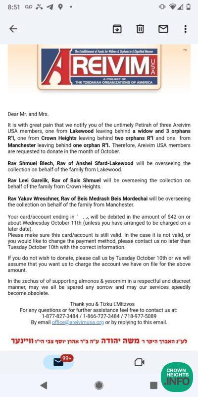 “It is with great pain that we notify you of the untimely Petirah of a member from Crown Heights leaving behind two orphans R”L,” a notice from Areivim said. “Therefore, Areivim USA members are requested to donate in the month of October”